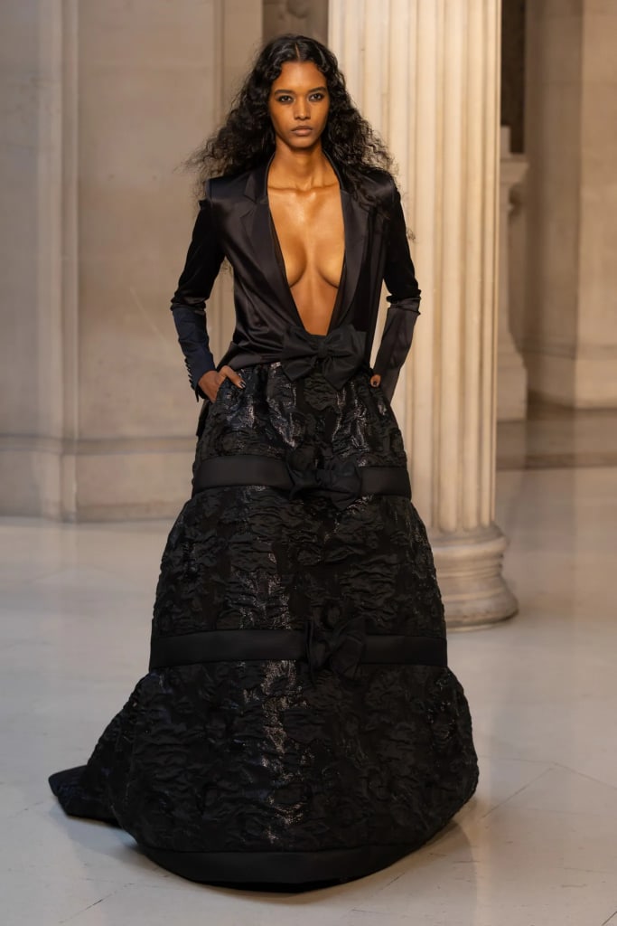The designer reduced oversized bow volumes and theatrical silhouettes in favor of garments designed to translate from runway to retail — without sacrificing drama.