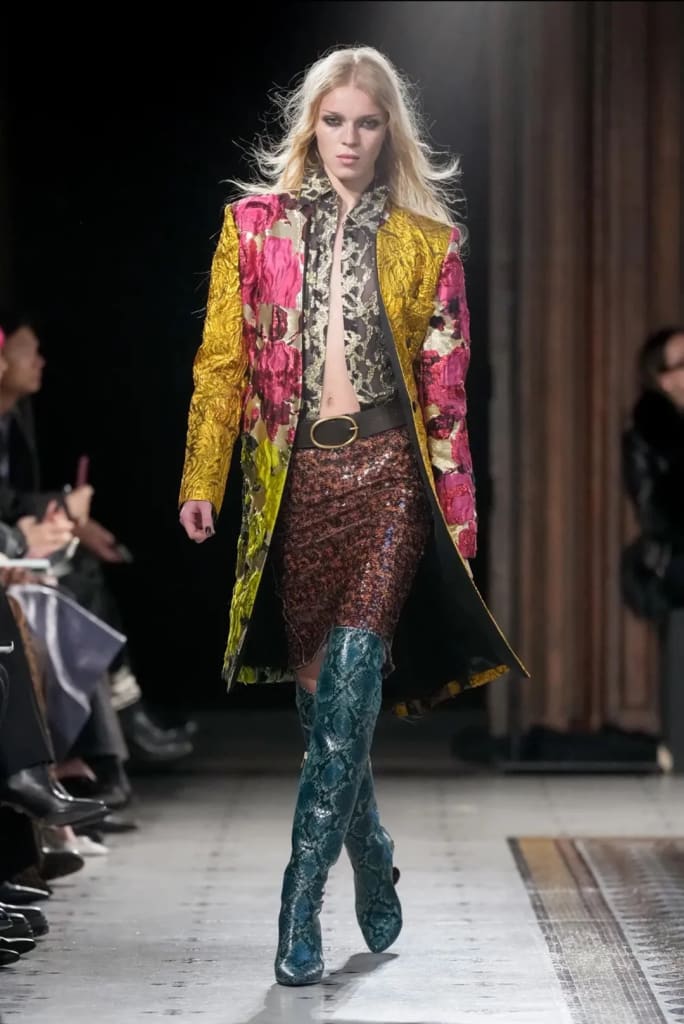 Moments after the runway finale, a video of Harris Reed and Carine Roitfeld head-banging to David Bowie went viral across Instagram. Between them sat iconic fashion show DJ Michel Gaubert, visibly unamused — a moment that perfectly summarized the season’s spirit.
